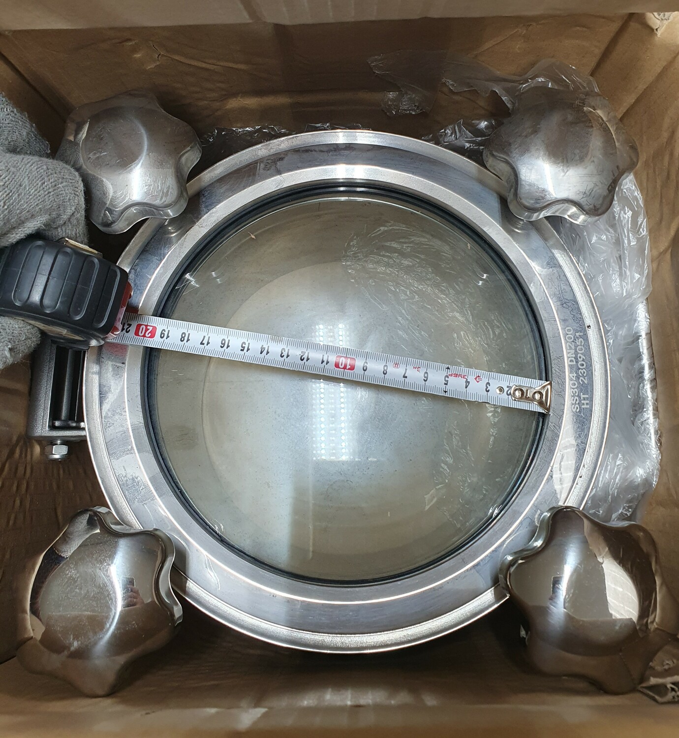 Люк круглый DN200х100 мм со стеклянной крышкой, давление до 3 бар, уплотнение EPDM, AISI304, 4 ручки